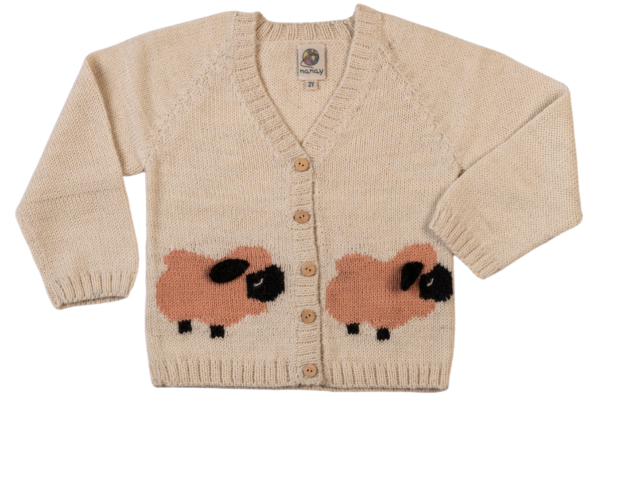 Each cardigan features adorable little lamb designs on the front and back — inspired by the playful lambs that roam the Bolivian highlands. With tiny tails and gentle details, these designs capture the innocence and joy of childhood while bringing a touch of nature’s charm to every outfit.